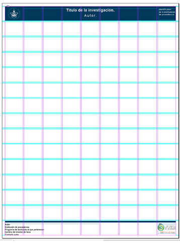 Formato y diagramación general. Con el fin de unificar criterios editoriales en el diseño de los carteles a presentar, se diseñó una retícula que permitiera organizar el formato requerido por el comité organizador del CNDIS 2015 que incluyera elementos básicos como el título de investigación, su autor, datos de contacto, entre otros. (Fig. 1). Dicha retícula fue diseñada por el Mtro. Abraham Ronquillo Bolaños, a partir de los requerimientos identificados después de analizar los extensos de los artículos científicos a presentar. La retícula utilizada consta de 9 columnas y 15 filas con un medianil de 5 milímetros, dispuestos en un formato de 90 por 120 centímetros.